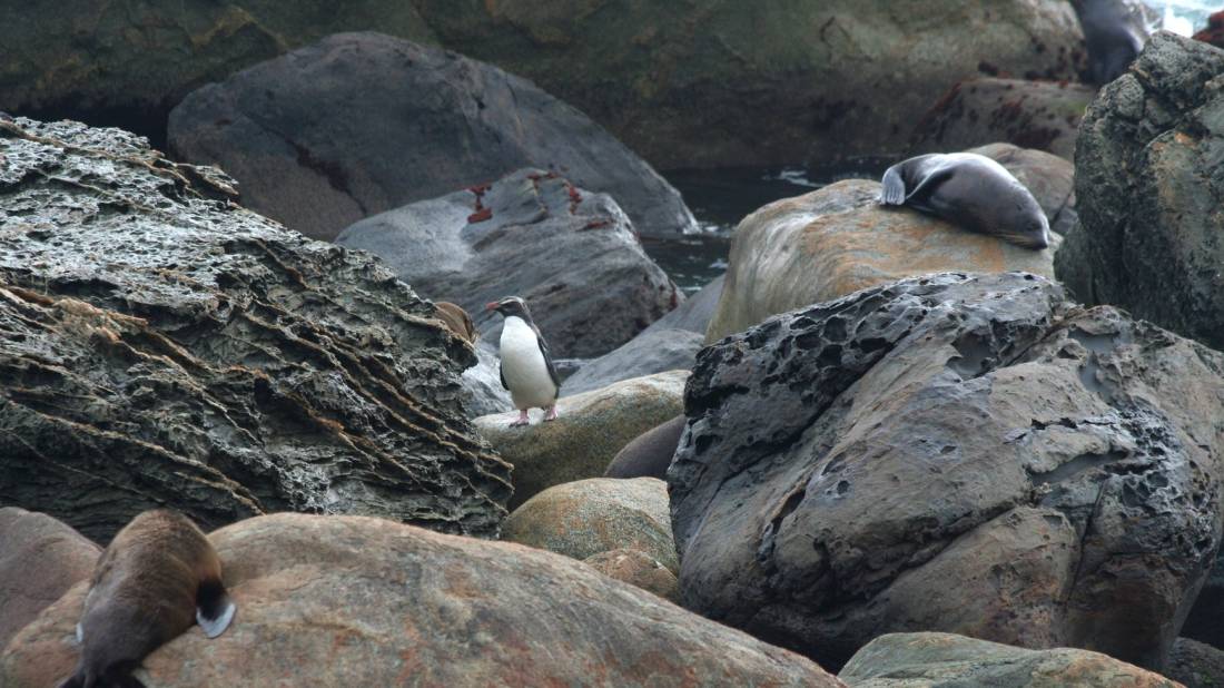 The rare Fiordland Crested Penguins nest in the flax bushes at Long Reef from July to December. They're generally visible in pairs, and entertaining to watch. Whilst they return to land between February and March to moult, they're rarely seen as they're timid and tend to hide.
